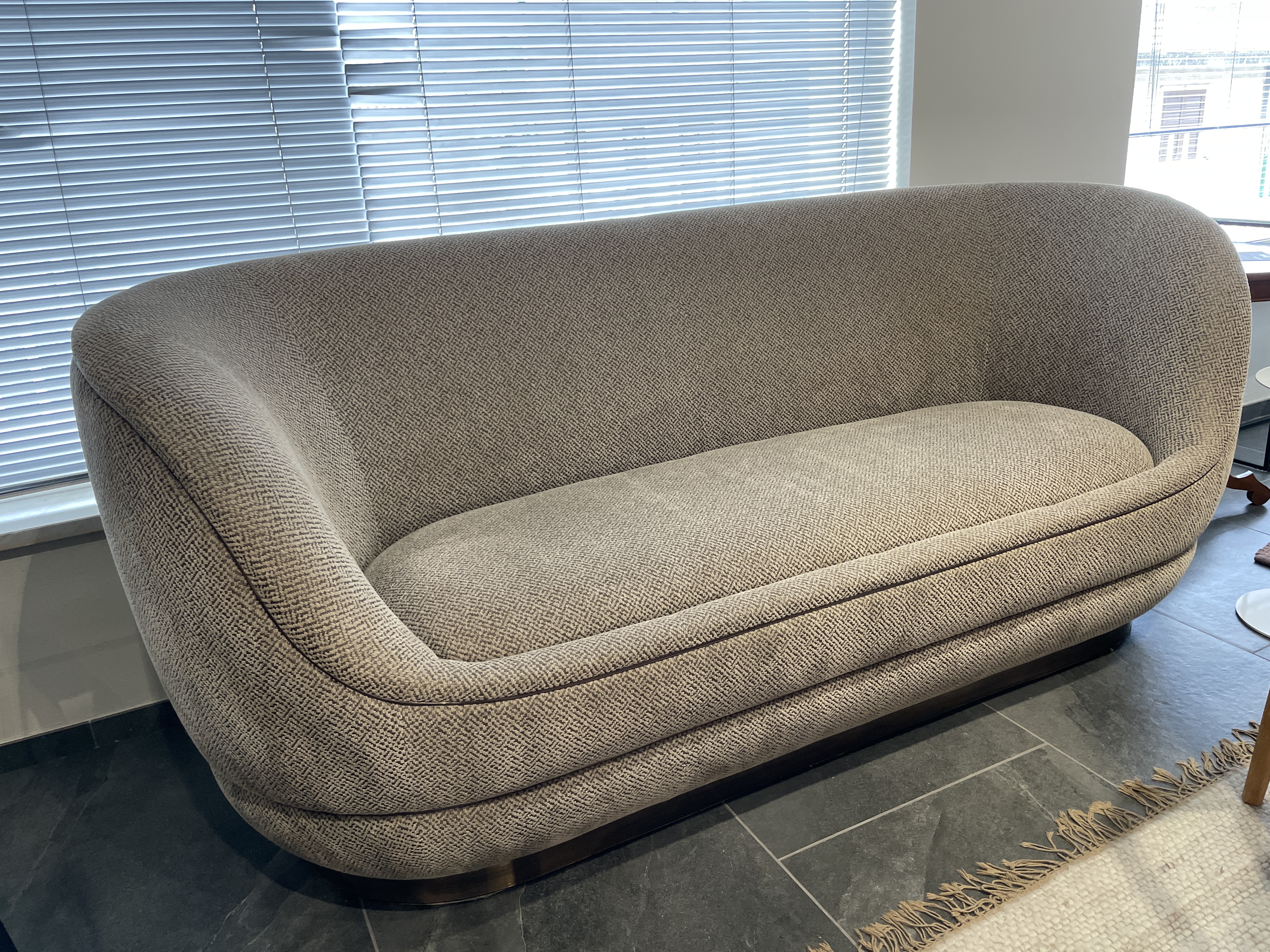Elegante divano curvo firmato Volpi modello Nido in tessuto con base in acciaio inox cromato.