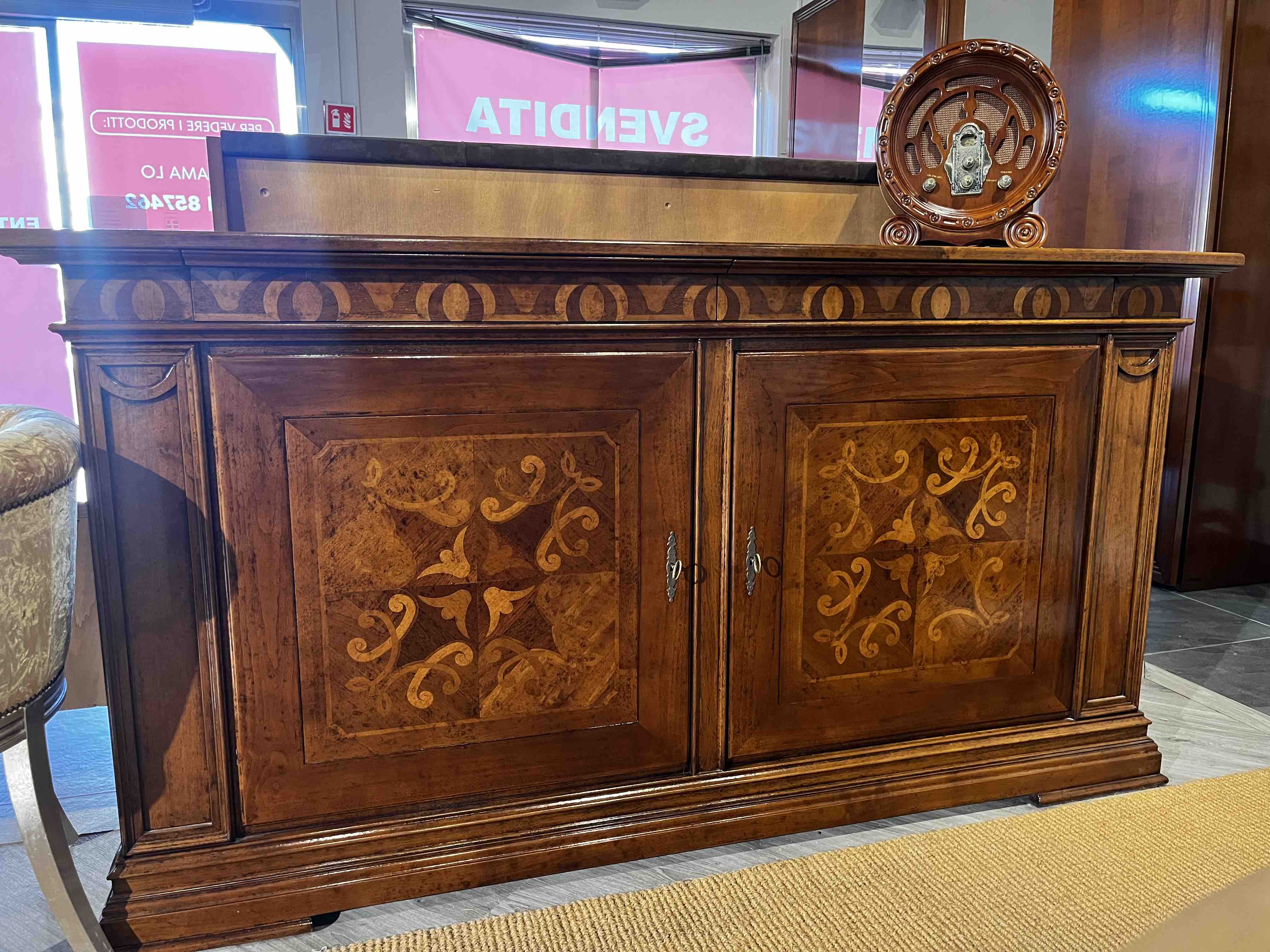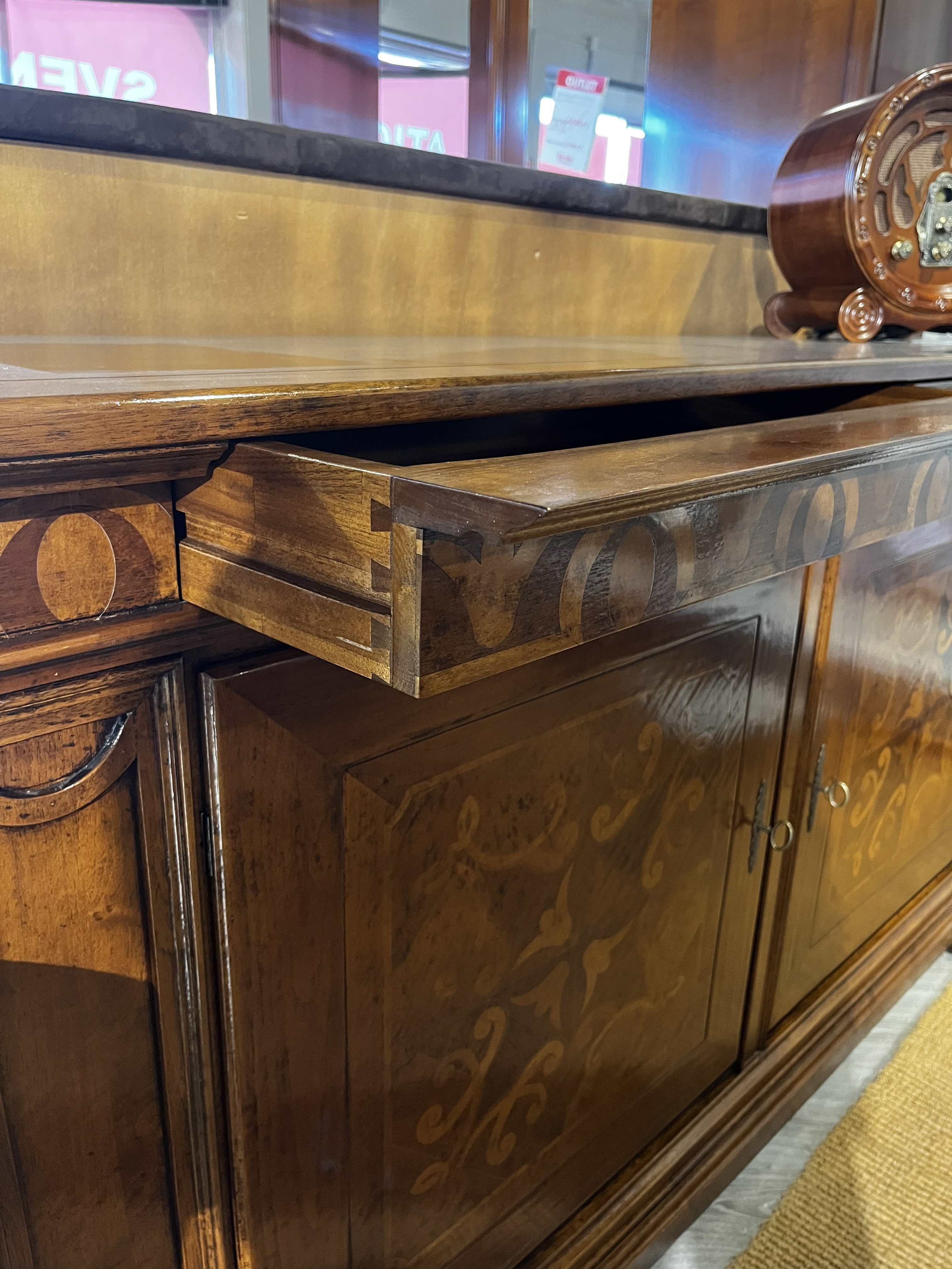 Madia in legno intarsiata con 2 ante e cassetti a scomparsa.