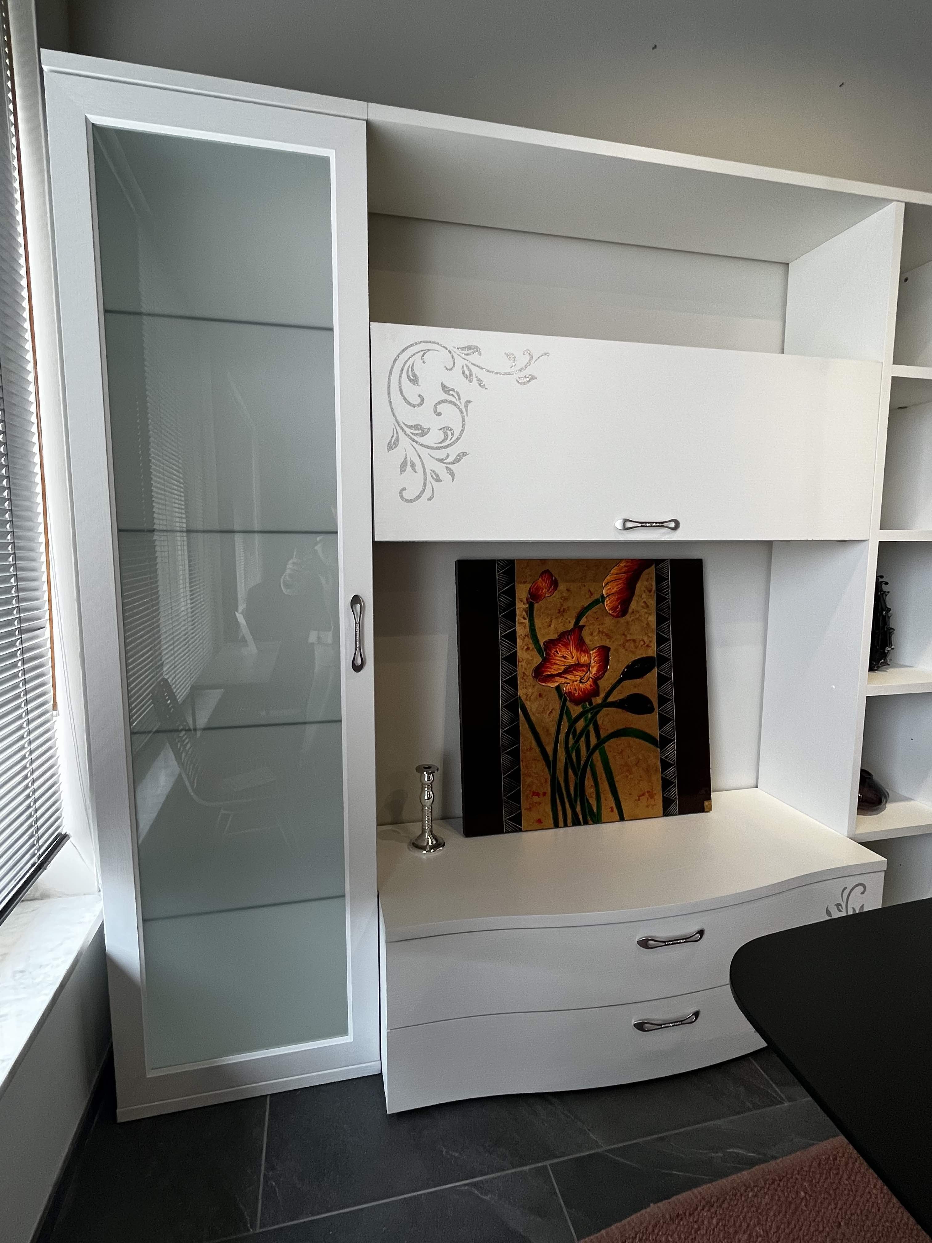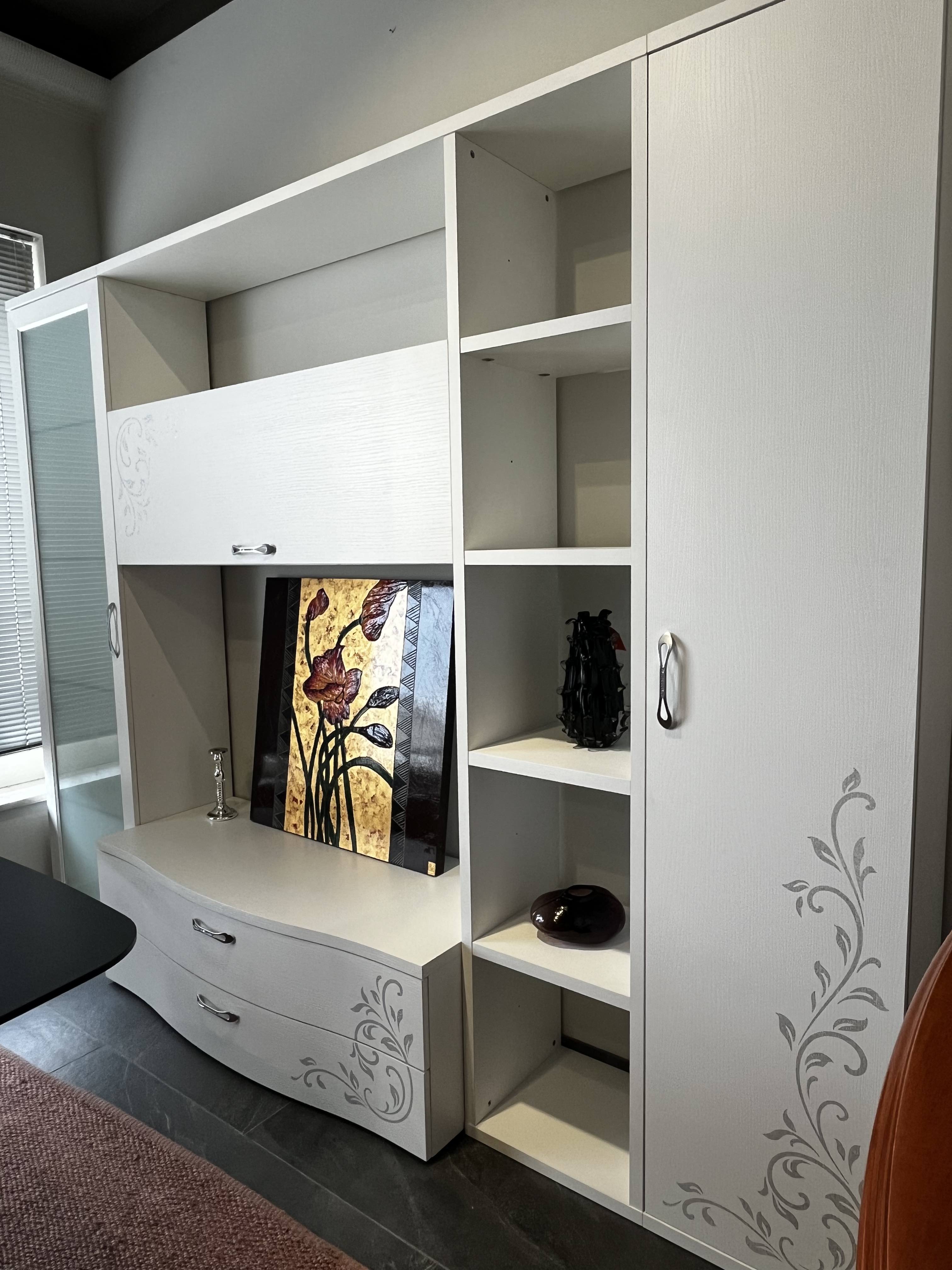 Parete attrezzata bianca con motivi floreali grigi; composta da vetrina, cassettiera, base per tv, mensole e anta a tutta altezza.